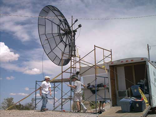 collection of homemade antennas, surplus 12 foot satellite dishes,